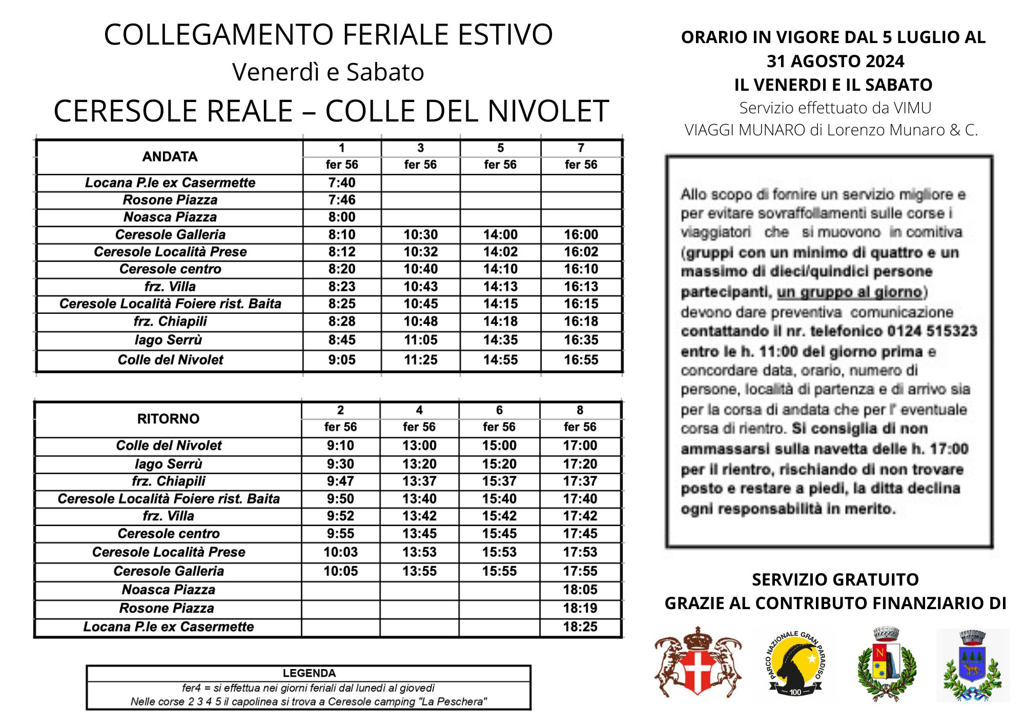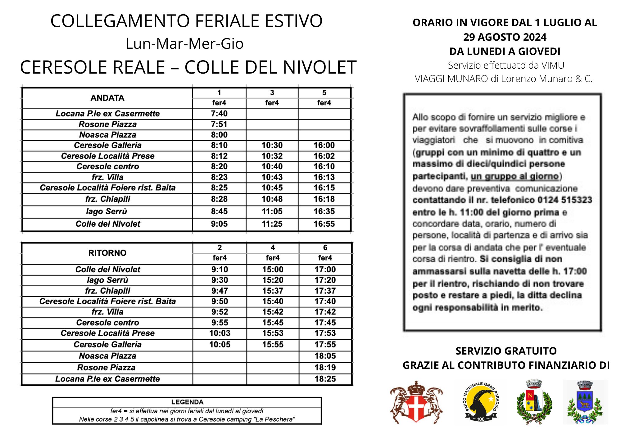 Allo scopo di fornire un servizio migliore e per evitare sovraffollamenti sulle corse i viaggiatori che si muovono in comitiva (gruppi con un minimo di quattro e un massimo di dieci/quindici persone partecipanti, un gruppo al giorno) devono dare preventiva comunicazione contattando il nr. telefonico 0124 515323 entro le h. 11:00 del giorno prima e concordare data, orario, numero di persone, località di partenza e di arrivo sia per la corsa di andata che per l' eventuale corsa di rientro.